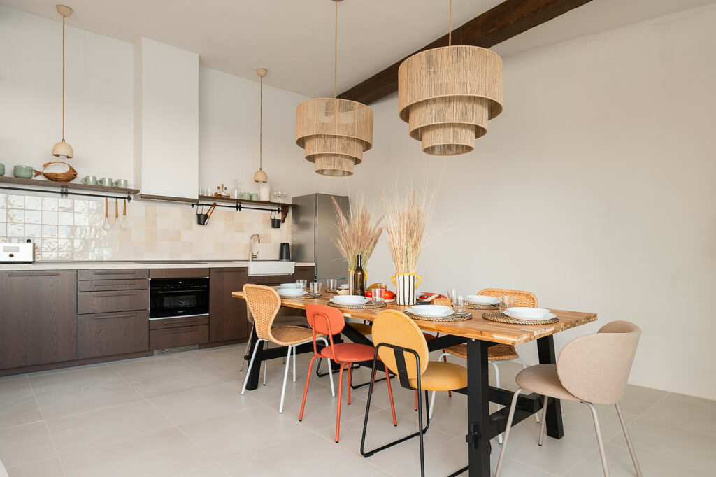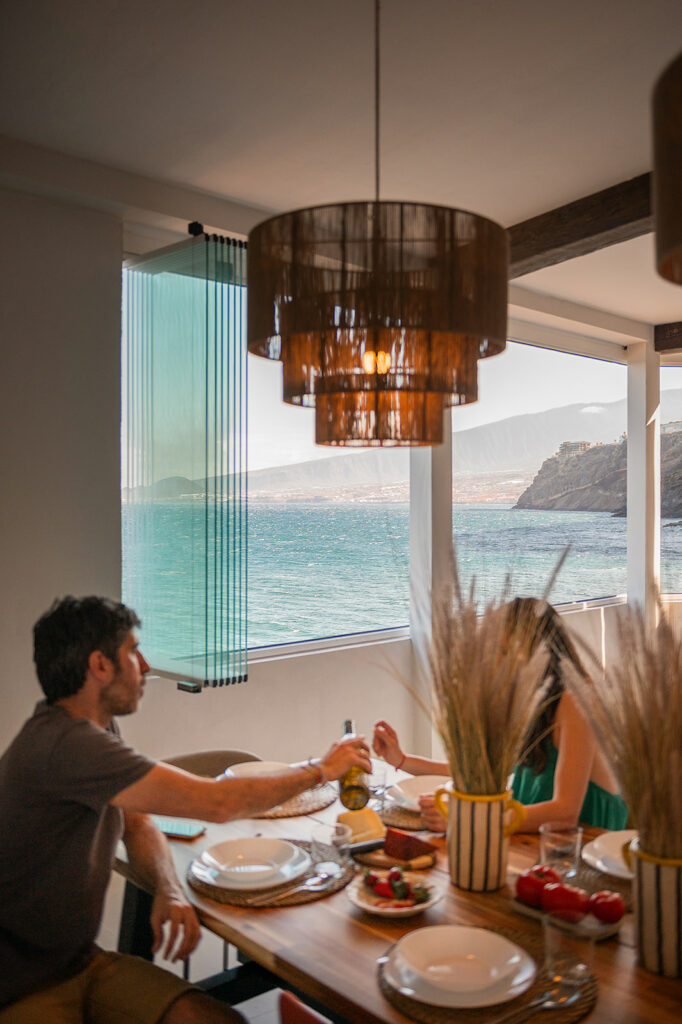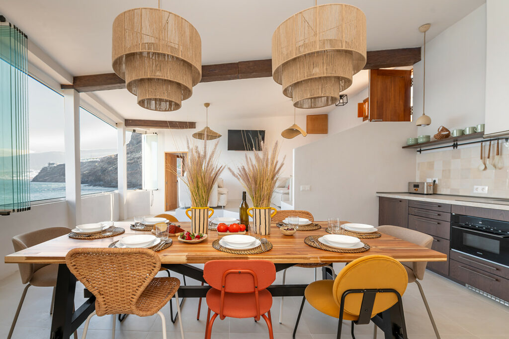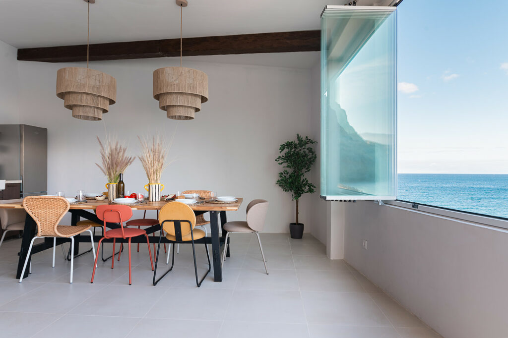 – Salรณn – cocina – comedor de grandes dimensiones, con un gran ventanal que te permite disfrutar de una espectaculares vistas al mar. La cocina es moderna y estรก totalmente equipada. Podrรกs comer en la gran mesa de comedor dรณnde caben 8 comensales de forma muy cรณmoda. Ademรกs, la zona de sofรกs te permitirรก descansar y relajarte con el sonido del mar.