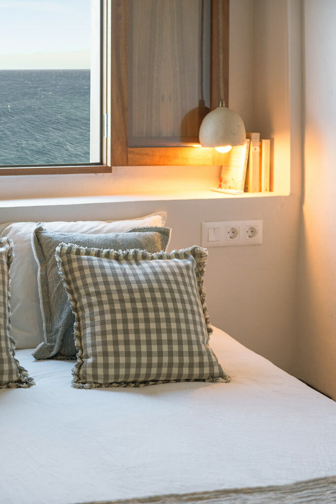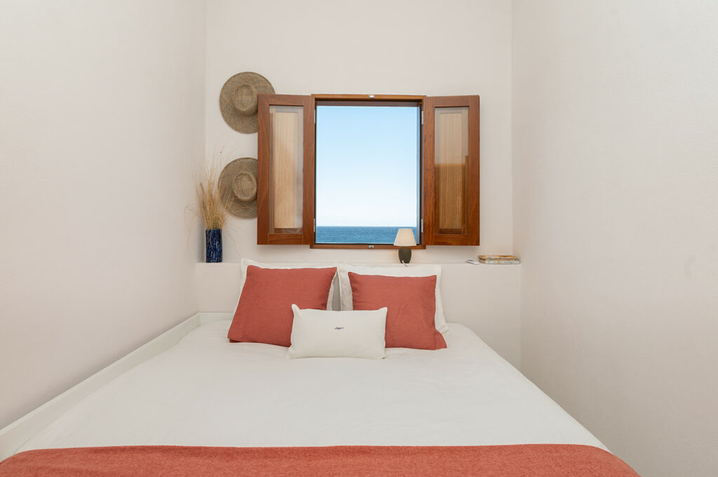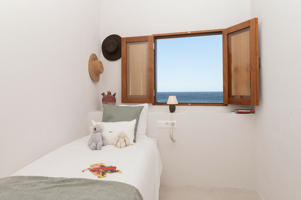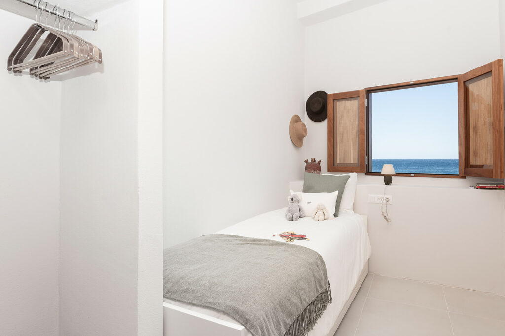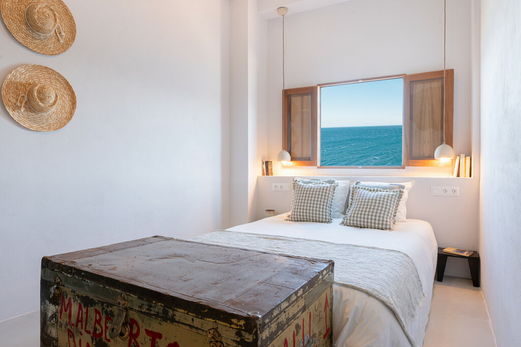 – En la planta de abajo encontramos las 3 habitaciones de la casa, todas con ventana con vistas al mar. Las tres habitaciones pueden ser dobles, aunque dos de ellas tambiรฉn se pueden montar como individuales ya que la cama es transformable.