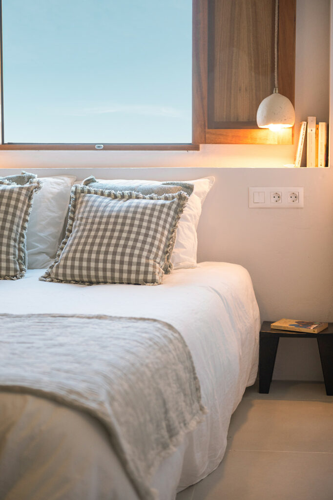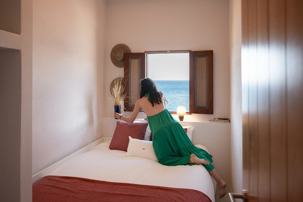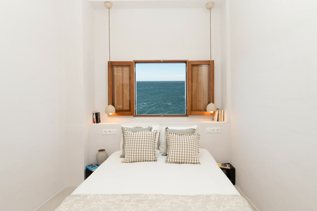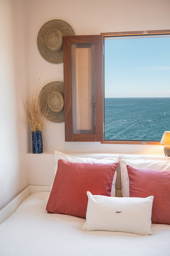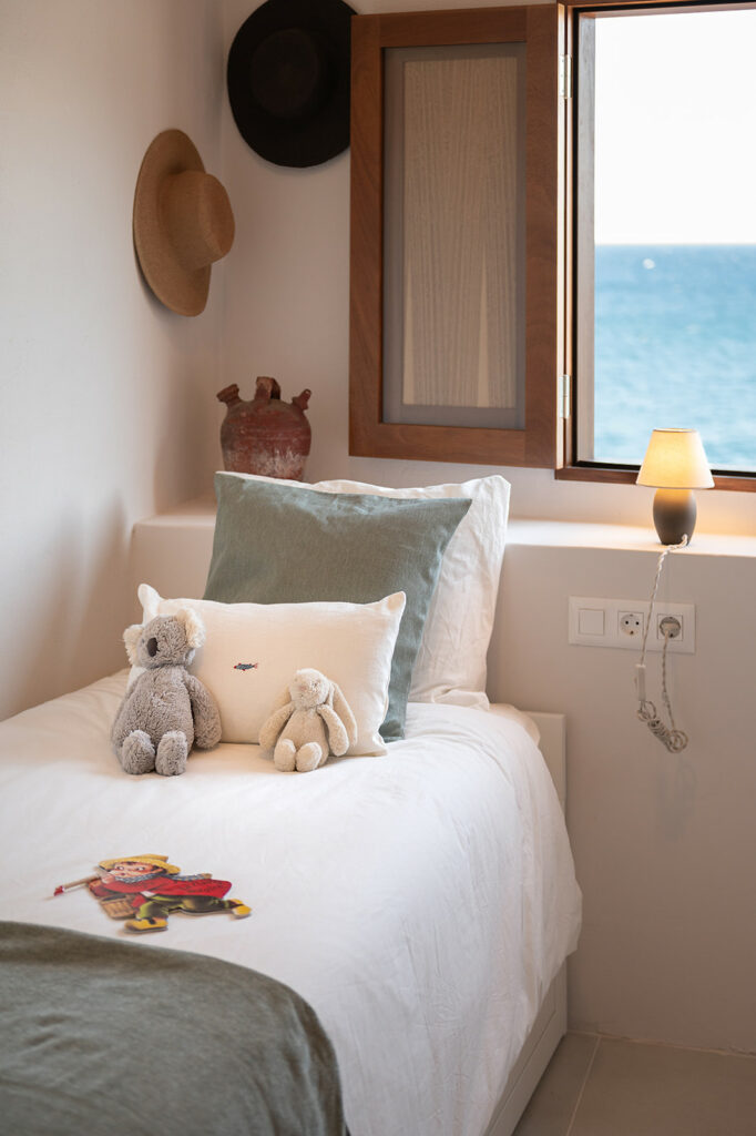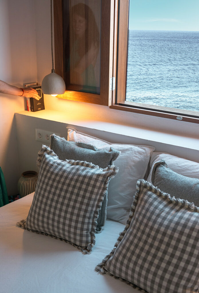 – En la planta de abajo encontramos las 3 habitaciones de la casa, todas con ventana con vistas al mar. Las tres habitaciones pueden ser dobles, aunque dos de ellas tambiรฉn se pueden montar como individuales ya que la cama es transformable.
